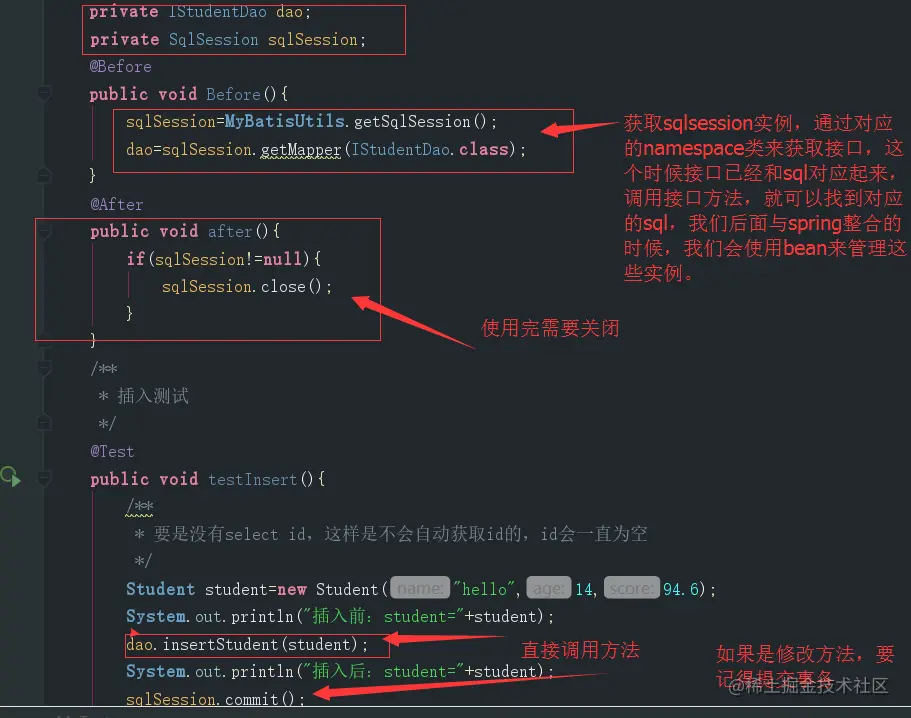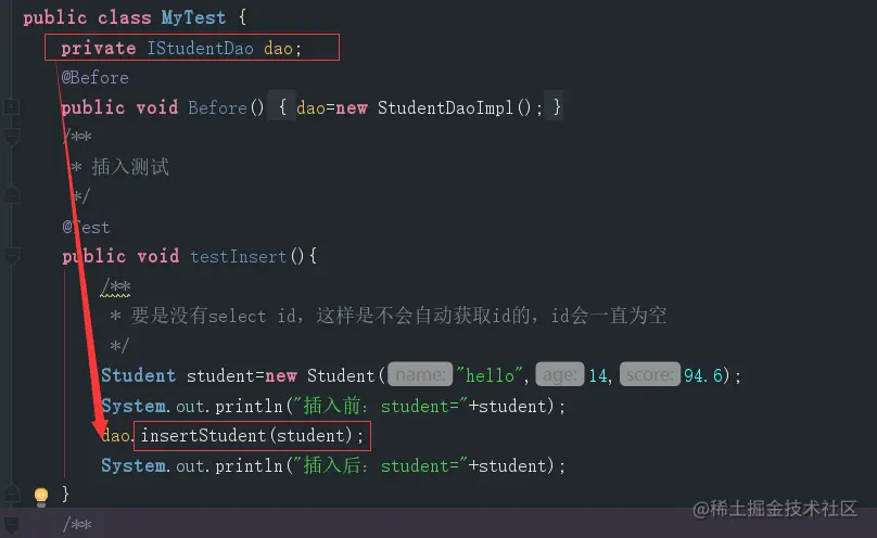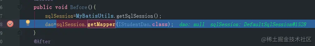 在之前的代码中我们的运行过程再梳理一下,首先我们执行Test,调用dao接口方法