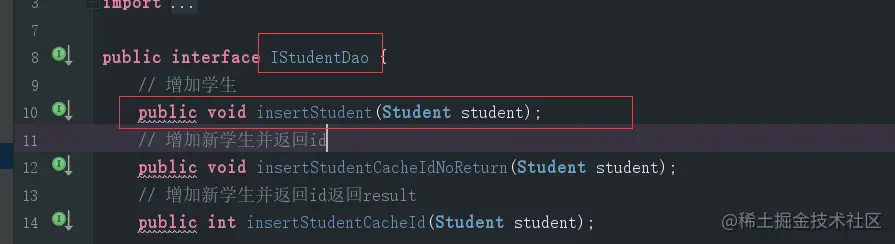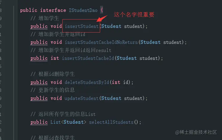 定义数据库查询的接口,里面每一个接口的名字很重要,需要和mapper里面每一条sql对应起来: