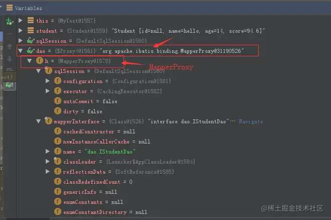 从下面的debug结果中我们可以看到,这是动态代理的结果,我们看到的是dao,但是动态代理对这个dao做了增强,实则是一个mapperProxy。