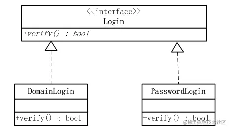 就拿登录功能来说,假如应用系统需要支持多种登录方式如:口令认证、域认证(口令认证通常是去数据库中验证用户,而域认证则是需要到微软的域中验证用户)。那么自然的做法就是建立一个各种登录方式都适用的接口,如下图所示: