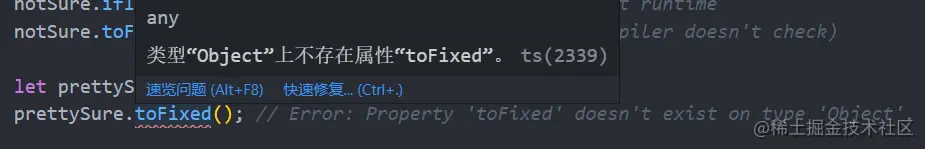 let prettySure: Object = 4; prettySure.toFixed(); // Error: Property 'toFixed' doesn't exist on type 'Object'. prettySure.toString() // OK如下图