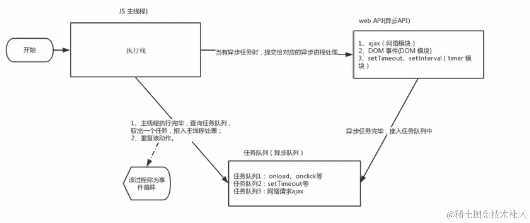 - 定时器,包括setInterval、setTimeout等 异步任务相关回调函数添加到任务队列中(任务队列也称为消息队列)。