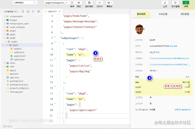 设置分包的别名并查看分包的体积