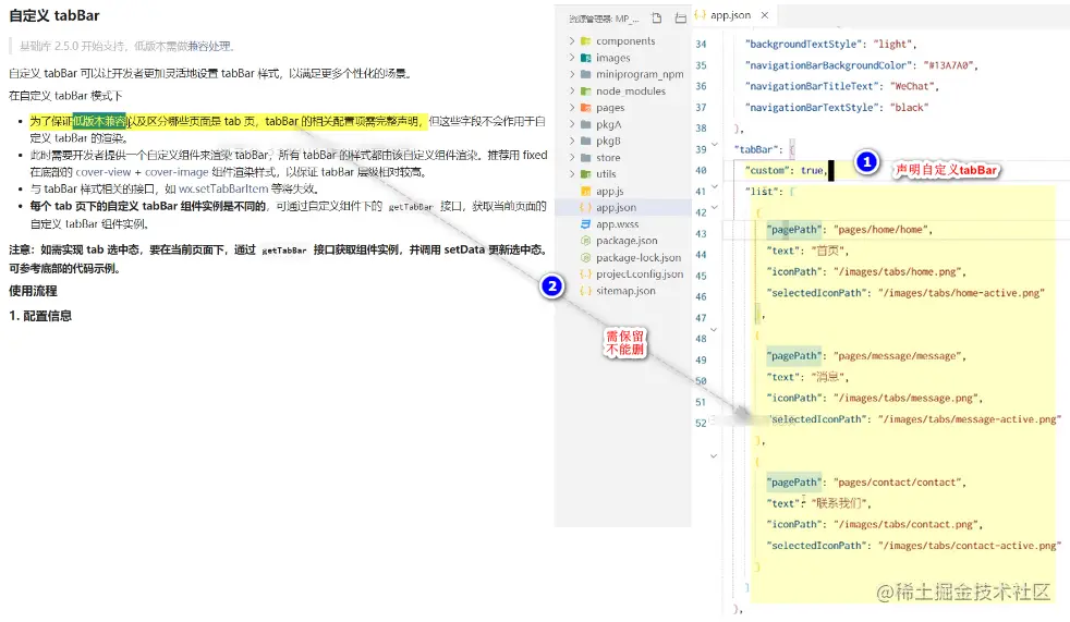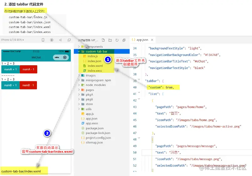 在app.json中声明自定义tabBar的配置信息