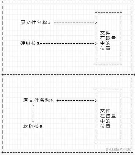 下图是关于软链接(符号链接)和硬链接的图解: