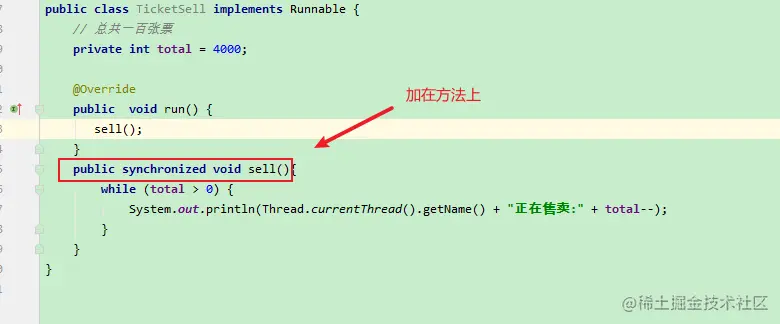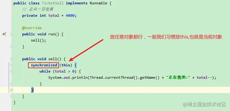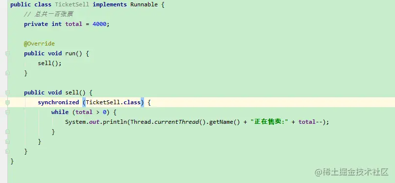 System.out.println(Thread.currentThread().getName() + "正在售卖:" + total--);