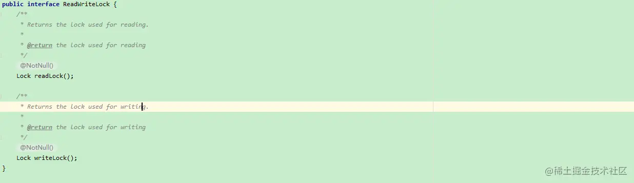 多线程协作的另一种场景就是读多写少,若干线程负责对共享变量进行更新,若干线程负责对共享变量进行读取,上面的CAS、synchronized、Lock就不怎么适合这种场景了,因为这些锁都是针对写线程的。针对上面的场景Java推出了读写锁,java.util.concurrent.locks.ReadWriteLock是对读写锁的抽象,其默认实现类是ReentrantReadWriteLock。