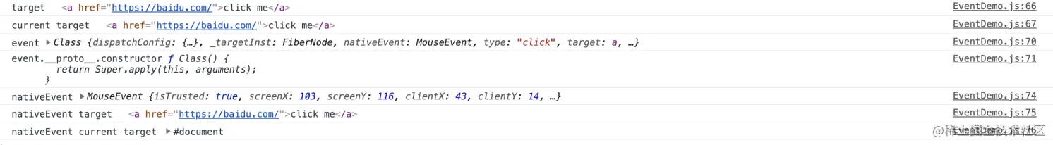 console.log('nativeEvent target', event.nativeEvent.target) // 指向当前元素,即当前元素触发