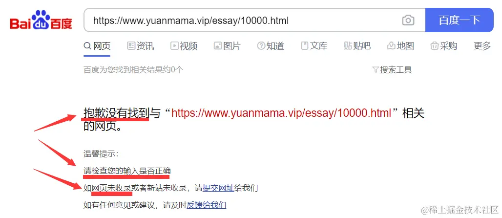 网址3的搜索结果截图如下,从搜索结果我们可以看出,该网址也没有被百度收录,且搜索结果中出现了“抱歉没有找到”,“请检查您的输入是否正确”,“网页未收录”等关键字。