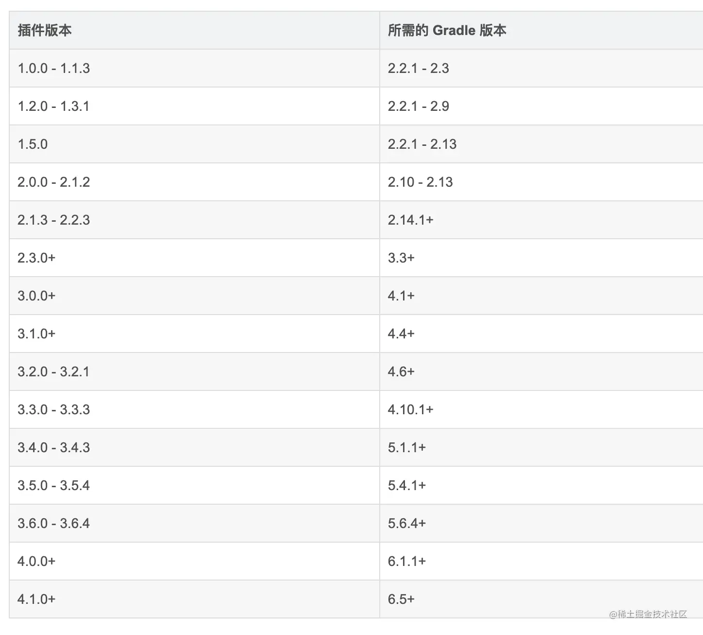 Gradle插件会有版本号,每个版本号又对应有一个或一些 Gradle发行版本(一般是限定一个最低版本)。下表列出了各个 Android Gradle 插件版本所需的 Gradle 版本。为了获得最佳性能,您应使用 Gradle 和插件这两者的最新版本: