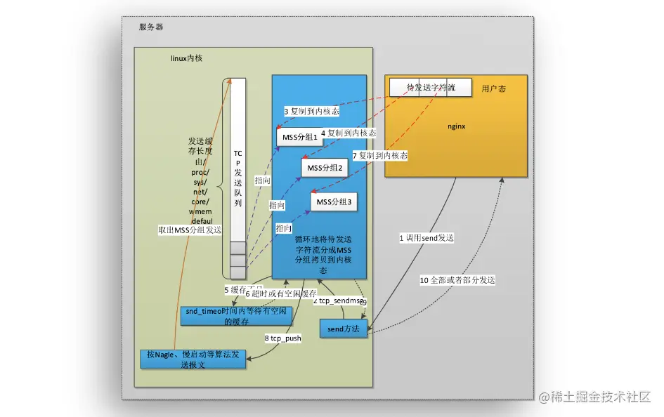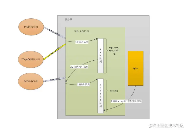 3次握手。第一次,客户端发送syn请求至服务端,服务端将调用接口插入操作系统的内核中的tcp_max_syn_backlog(又称之为syn队列);第二次,服务端回复syn+ack至客户端;第三次,客户端发送ack请求至服务端,服务端从调用接口从系统内核的syn队列取出该次syn请求,并放置backlog(又称之为accept队列);服务端就可以accept队列获取tcp连接;