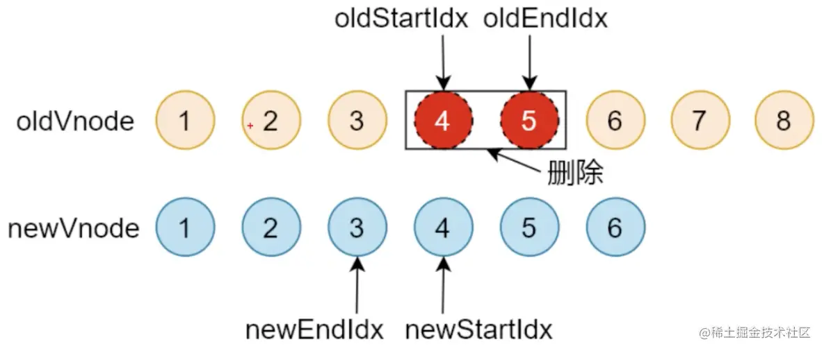 - 如果新节点的数组先遍历完,说明老节点有剩余,把剩余节点批量删除