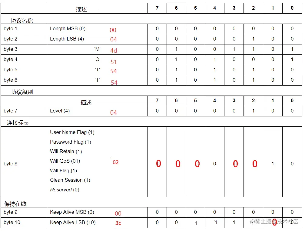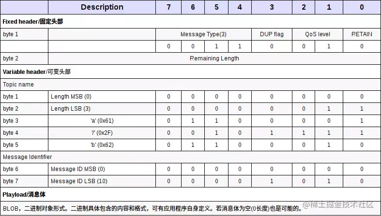 在当前消息中剩余的byte(字节)数,包含可变头部和负荷(称之为内容/body,更为合适)。单个字节最大值:01111111,16进制:0x7F,10进制为127。单个字节为什么不能是11111111(0xFF)呢?因为MQTT协议规定,第八位(最高位)若为1,则表示还有后续字节存在。