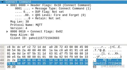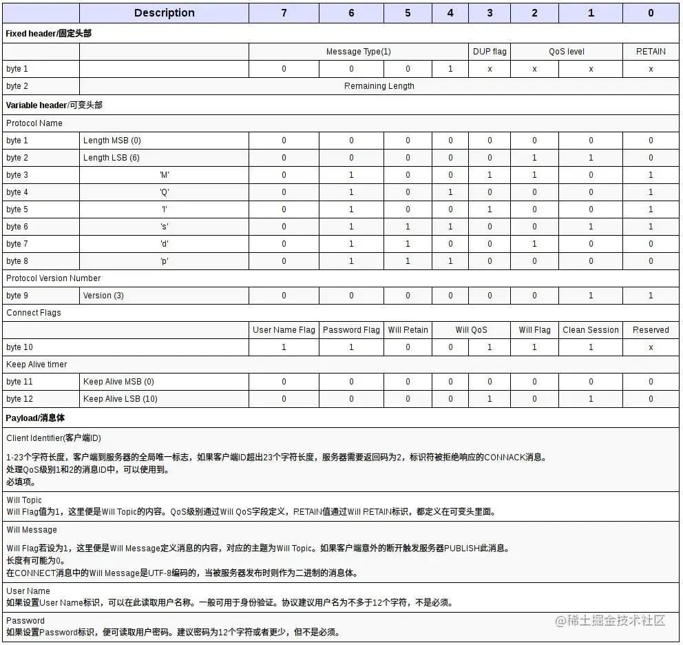 如果一个ClientID已经与服务器连接,则持有同样ClientID的旧有连接必须由服务器关闭后,新建立才能建立。下面是一个较为完整的CONNECT消息结构: