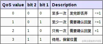 仅针对PUBLISH消息。不同值,不同含义: