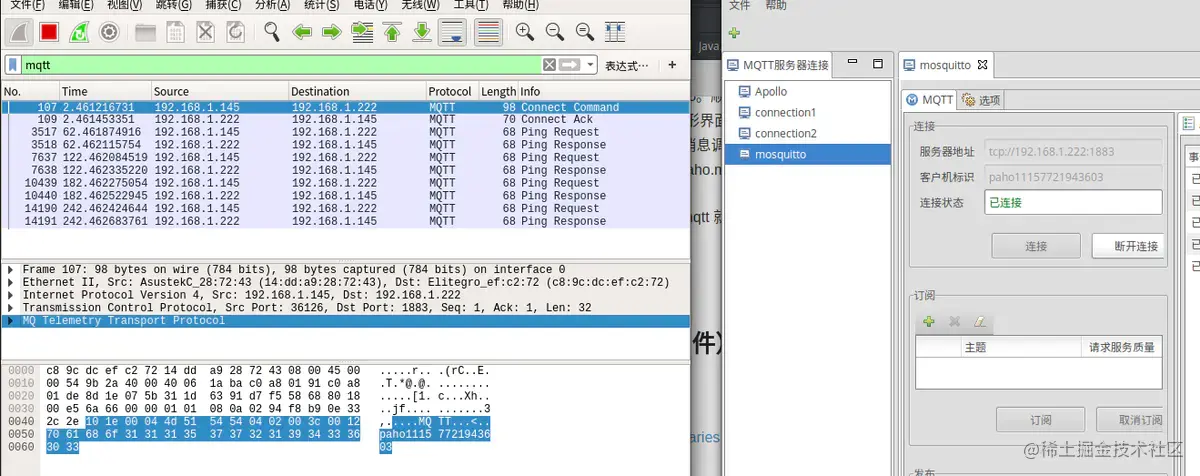 由于mosquito没有提供可视化界面,在自己不搭建可视化界面的情况下,我们可以用两个客户端订阅同一主题来测试mosquito服务器。mosquito至此就基本ok了。