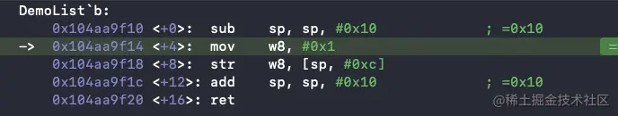 a函数不同的是,a函数是存储在FP-0x4的位置,b函数存储在SP+0xc的位置,还可以发现在b函数的汇编代码中,没看到保存a函数的FP(x29)和LR(x30)的指令,猜测是因为b函数已经处于整个调用链的最后,它没有调用其他的函数,因此不需要专门记录了,只需要在执行完毕之后返回到LR的指令就可以了