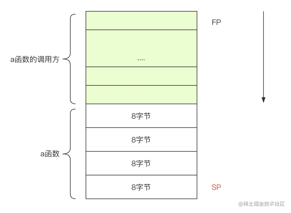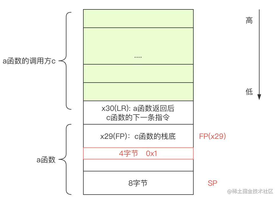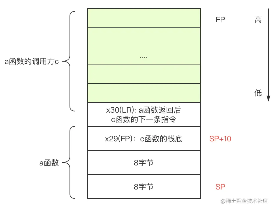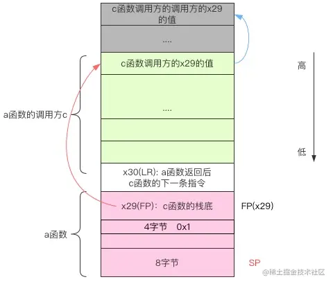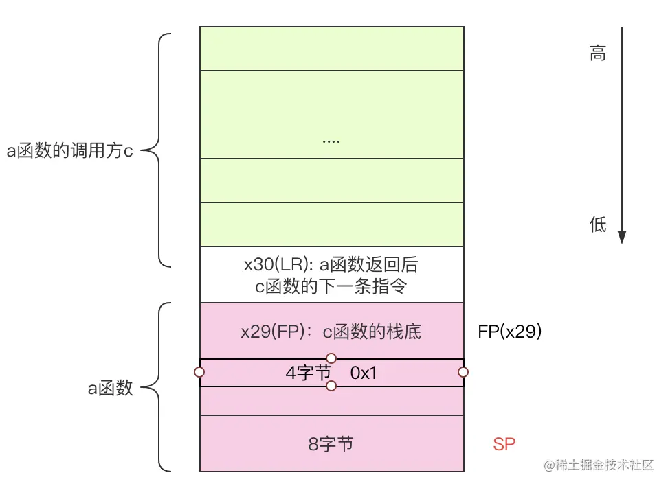 当前栈顶SP+0x10存入x29寄存器中,相当于FP指向了SP+0x10,此时FP指向了函数a调用栈的栈底,其中存储的是调用方c函数的栈底