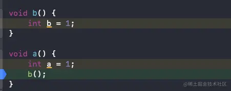 stepinto按钮,进入b函数的实现,可以看到b函数的第一条指令的地址就是