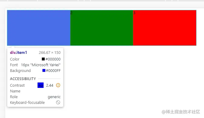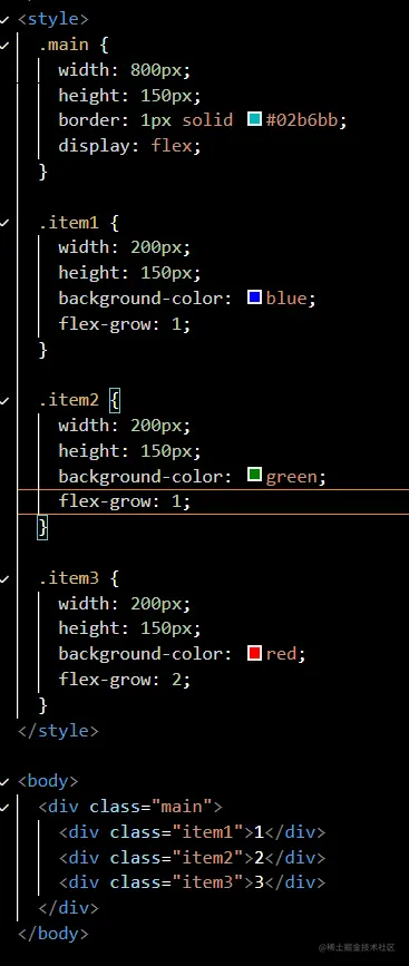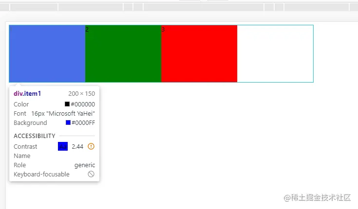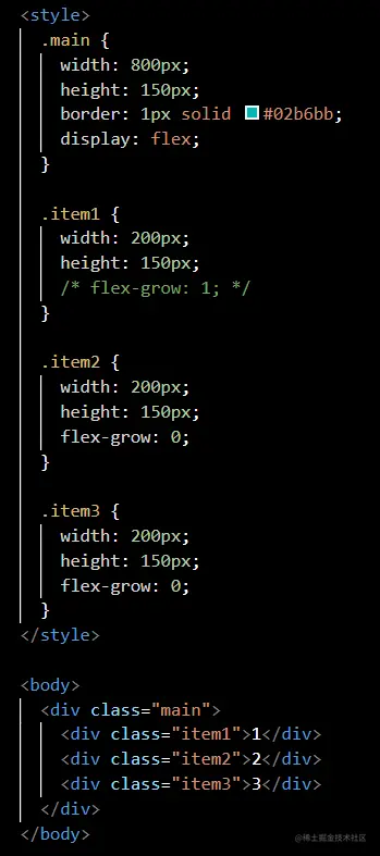 我们可以看到,当flex元素的flex-grow为0时,flex元素并不会伸长去填满父容器的剩余空间,而是以设定的宽度显示。