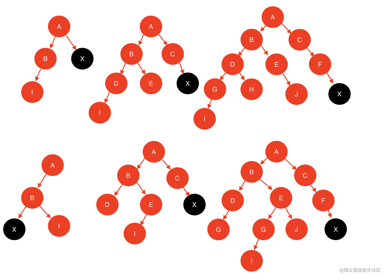 常见的删除结构(以删除右侧黑色节点X为例,局部相似记得忽略,避免陷入过多情形陷阱)如下: