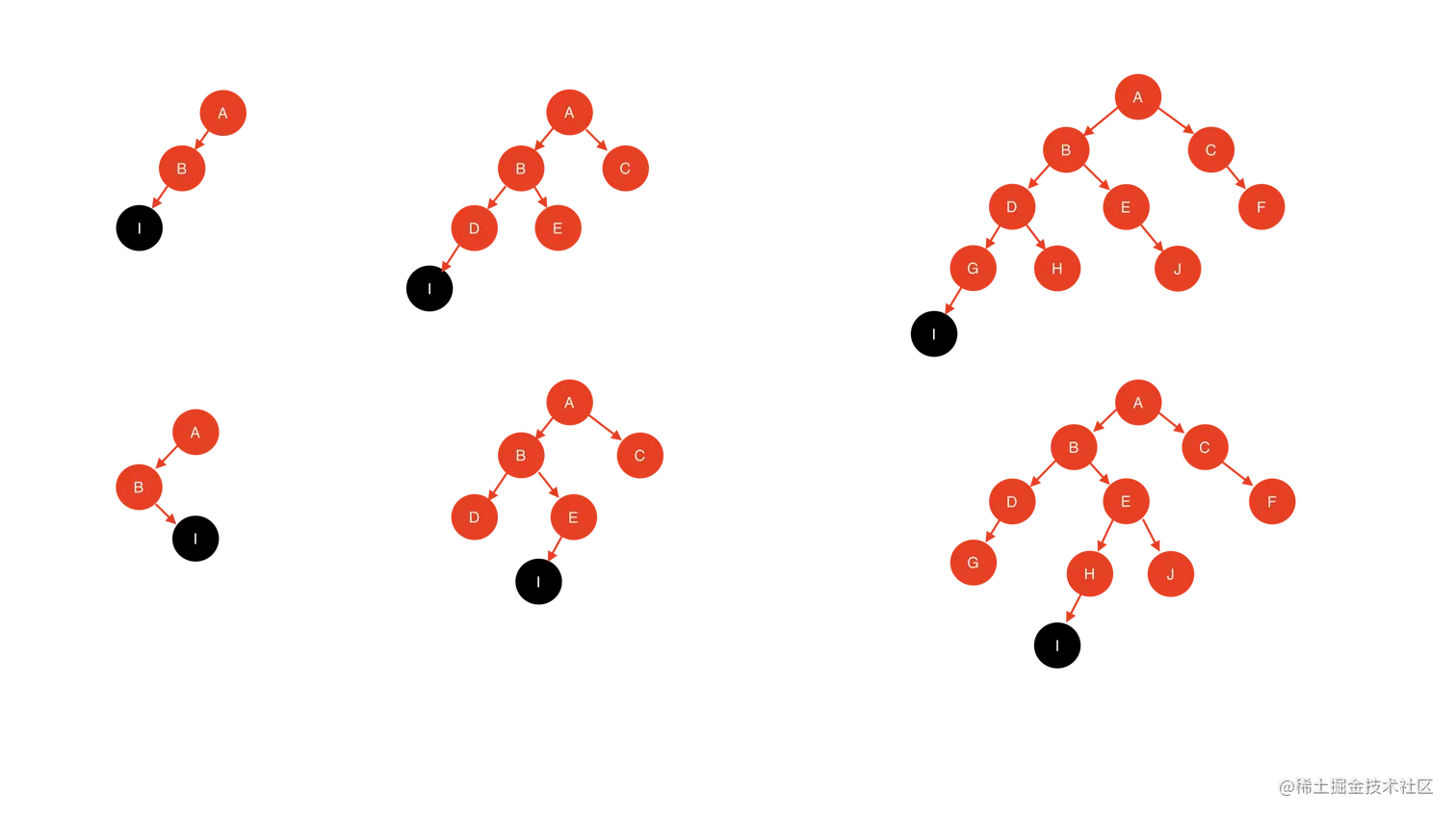 常见的插入后失衡结构(以插入左侧黑色节点I为例,局部相似记得忽略,避免陷入过多情形陷阱)如下: