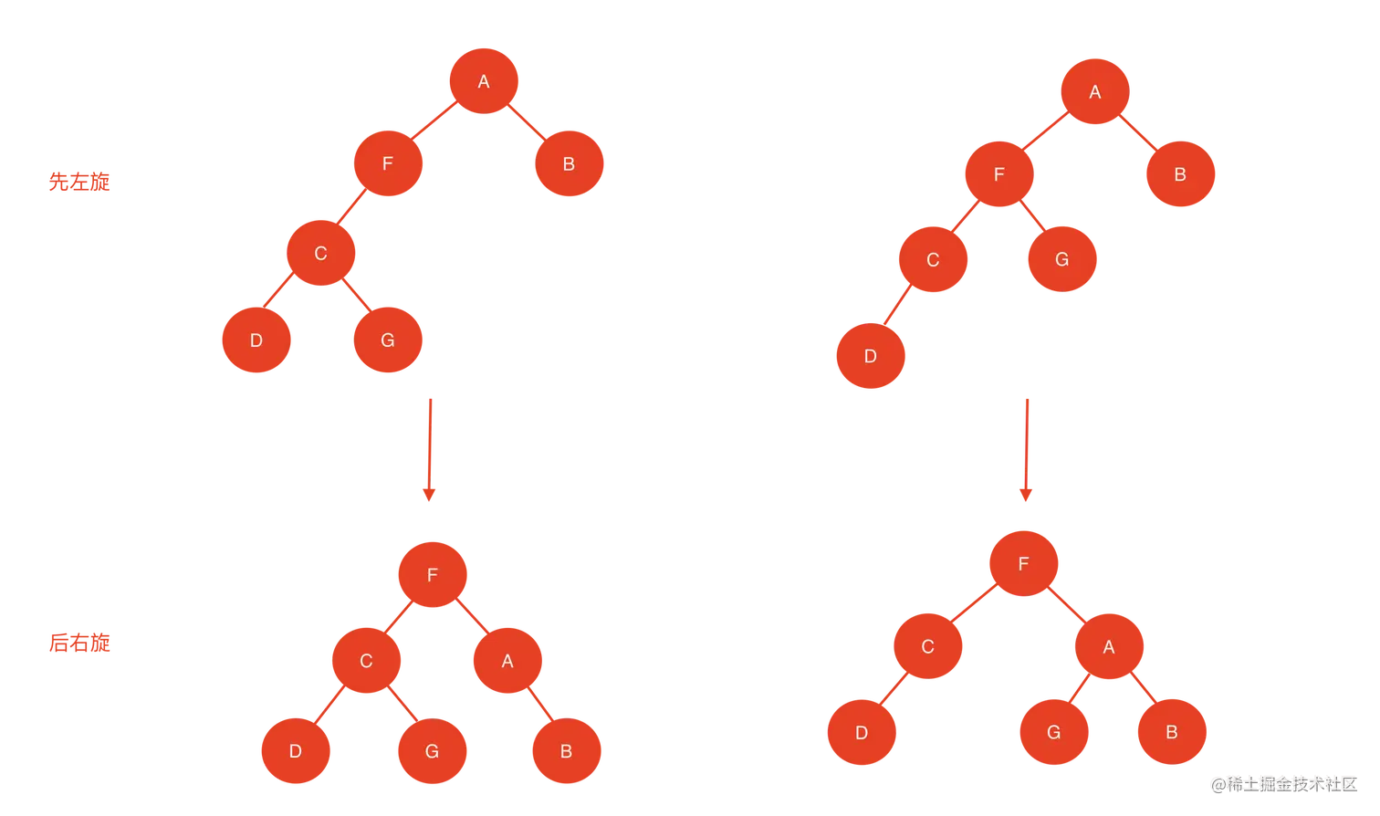 注意:如果B、D、G节点同时不存在,那么结果是一样的只不过是携带空节点的旋转而已,这里就不做介绍了