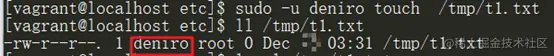 sudo 命令配合 -u 属性,可以切换到某个账户执行某些指令。格式为:sudo -u {希望切换的账户名} {需要执行的命令}。比如我们当前的身份是 vagrant,希望在 tmp/ 下,以 deniro 账户身份新建一个 t1.txt,就可以键入:sudo -u deniro touch /tmp/t1.txt。