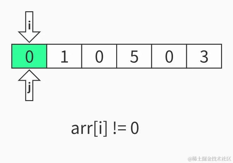 两次循环执行时间0ms,这样就已经算是完美解决了。但确实还可以只花一次循环就能解决,我们在遍历过程当中是保证其他顺序不变然后零到后面。上面的想法不就是扫描非0然后扫描一个就往前面设置然后指针移动一。那么同样我们去确定零的位置然后交换始终保证数字在最左零的左边即可
