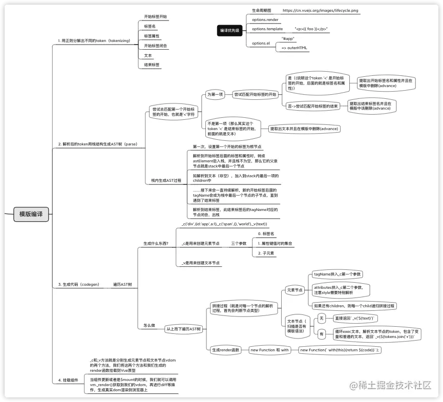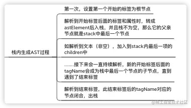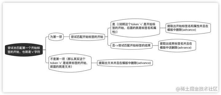 核心策略就是首先用正则对html模版进行词法分析,解析出不同的token,在解析这些token的时候可以得到对应的标签开始、结束以及里面的文本,利用一个栈结构不断的入栈、出栈生成AST树,最后将AST树转化成代码,再构建虚拟dom,进而生成真实dom,patch到页面上去。