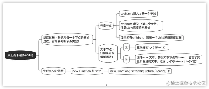 _c('div',{id:'app',a:1},_c('span',{},'world'),_v(text))。其中_c方法的三个参数分别代表了标签名、属性键值对的集合、子元素集合。具体过程如下图: