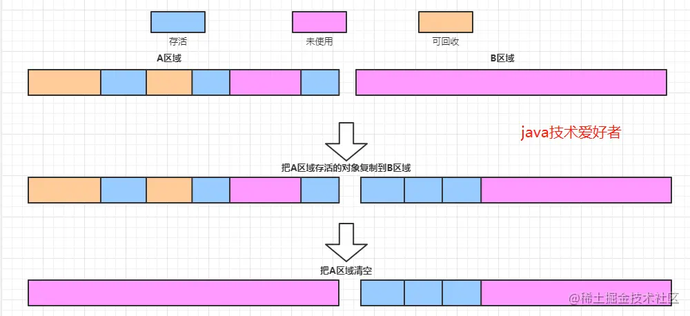 把内存分成两份,分别是A区域和B区域,第一步根据可达性算法把存活的对象标记出来,第二步把存活的对象复制到B区域,第三步把A区域全部清空。这就是复制算法。