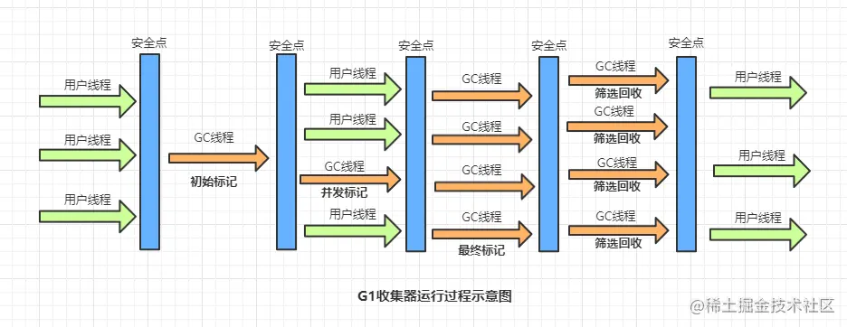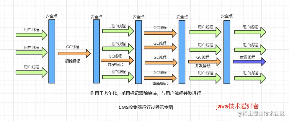 - 并发清除:清除对象,可以和用户线程并发执行。