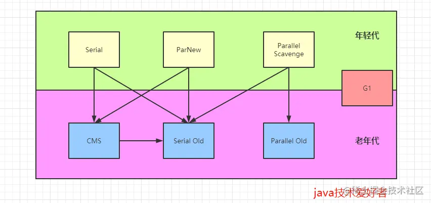 常见的垃圾收集器除了G1垃圾收集器外,都是只作用于一个区域,要么年轻代要么老年代,所以一般是配合使用,总共有7种,怎么配合使用,请看下面这张图,有连线的就是可以配合使用的。