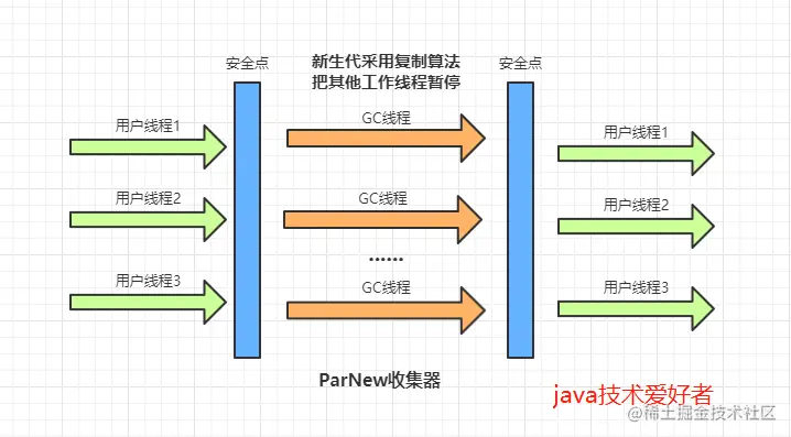 ParNew 收集器是Serial收集器的多线程版本,作用于年轻代,默认开启的收集线程数和cpu数量一样,运行数量可以通过修改ParallelGCThreads设定。