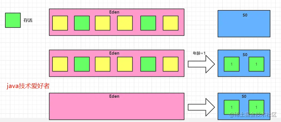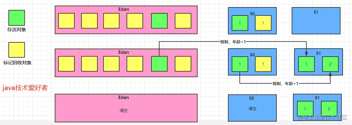 接着继续到下一次触发GC时,就会把Eden区和S0区的存活对象复制到S1区,然后清空Eden区和S0区。每次垃圾回收后S0和S1区的角色互换。每次GC后,如果对象存活下来则年龄加一。