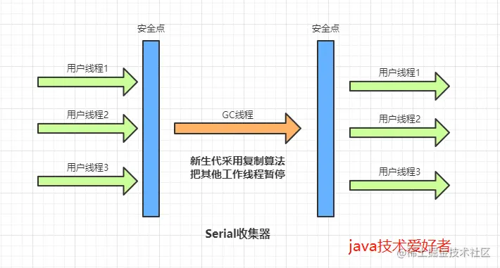 Serial收集器作用于年轻代,单线程的垃圾收集器,单线程意味着它只会使用一个CPU或者一个线程去完成垃圾回收的工作,当它在垃圾回收时,由于SWT机制,其他工作线程都会被暂时挂起,直到垃圾回收完成。这种垃圾收集器适用于Client模式的应用,在单CPU的环境下,由于没有和其他线程交互的开销,可以专心垃圾回收的工作,能够把单线程的优势发挥到极致,简单高效。通过-XX:+UseSerialGC可以开启这种回收模式。