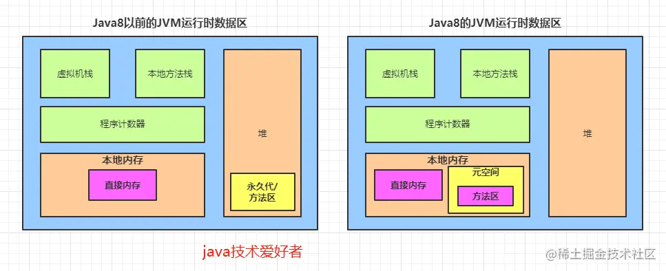 - 方法区:在Java8之前有永久代的概念,在堆中实现,受GC的管理,主要存储类的信息,常量,静态变量,由于永久代有 -XX:MaxPermSize 的上限,所以很容易造成 OOM。在Java8之后,永久代被移除,然后把方法区的实现移到了本地内存中的元空间中,这样方法区就不受 JVM 的控制了。元空间的本质和永久代类似,都是对JVM规范中方法区的实现。不过元空间与永久代之间最大的区别在于:元空间并不在虚拟机中,而是使用本地内存。因此,默认情况下,元空间的大小仅受本地内存限制。所以Java8以后,方法区也不需要GC。