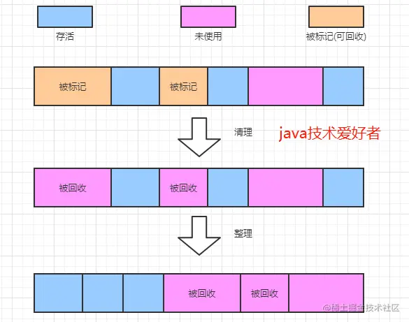 前面两个步骤和标记清除算法一样,而不同的是在标记清除算法的基础上多了一步整理的过程。如图所示,整理步骤的时候,将所有存活的对象都往左边移动,然后清理另一端的所有区域,这样就不会产生内存碎片。