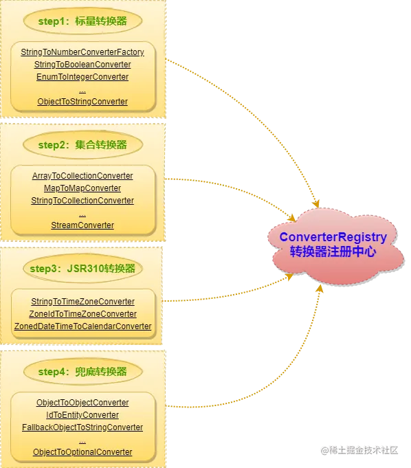 该静态方法用于注册全局的、默认的转换器们,从而让Spring有了基础的转换能力,进而完成绝大部分转换工作。为了方便记忆这个注册流程,我把它绘制成图供以你保存: