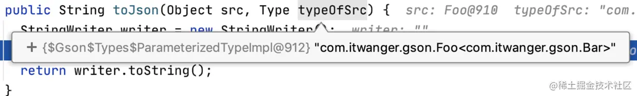 debug 进入 toJson() 方法内部查看的话,就可以看到 foo 的真实类型了。