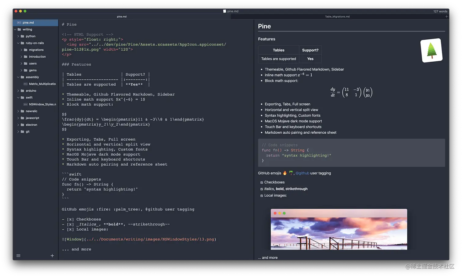 22、Pine:一个免费、轻量、简洁的 macOS Markdown 编辑器。功能: