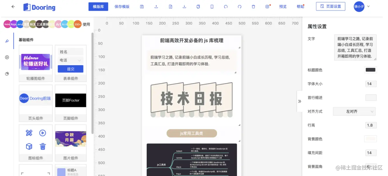 12、h5-Dooring:一款功能齐全的 H5 页面可视化配置平台。让你通过可视化的方式制作出 H5 页面,技术栈以 React 为主,后台采用 Node.js 实现。虽然网上有很多这种工具,但本项目免费开源、功能齐全值得一试
