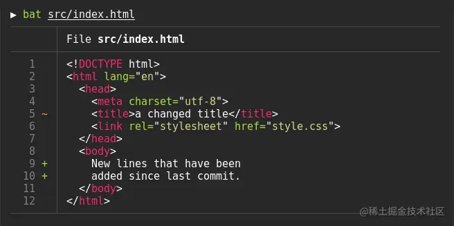 25、bat:替代 cat 的命令行工具。你还在命令行用 cat 查看文件吗?那你就 out 啦!今天推荐的 bat 它不仅支持语法高亮,还能展示 Git 的改动。macOS 下安装命令:brew install bat 相信你用过 bat 后就不会再想用回 cat 了