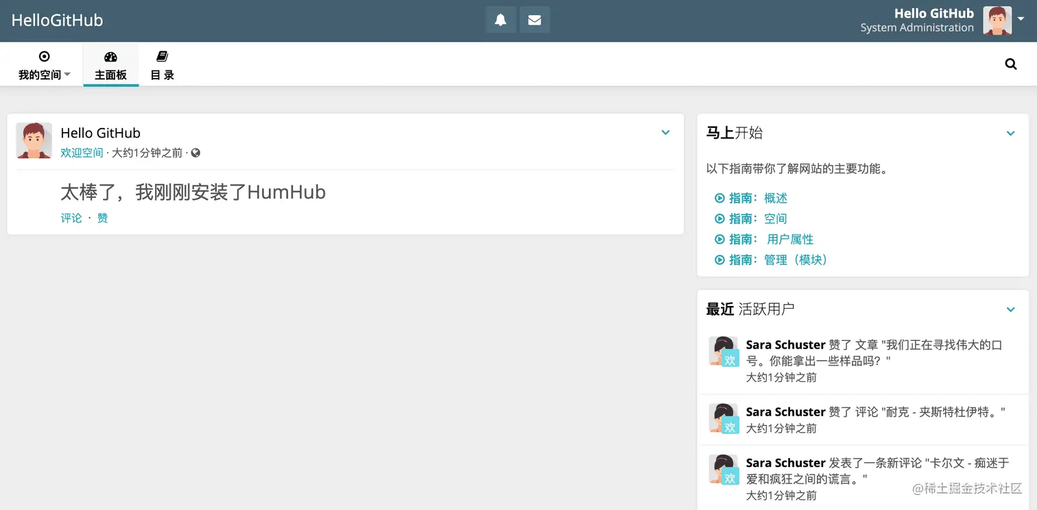 17、humhub:用 PHP 写的开源社交平台。看过《社交网络》的小伙伴,都知道大名鼎鼎的 Facebook 最早就是扎克伯格用 PHP 语言写出来的,humhub 能够让不会编程的小伙伴也可以用创建出一个社交平台啦。跟着提示一步步操作,不到 1 分钟我的社交平台就建好了,点击访问