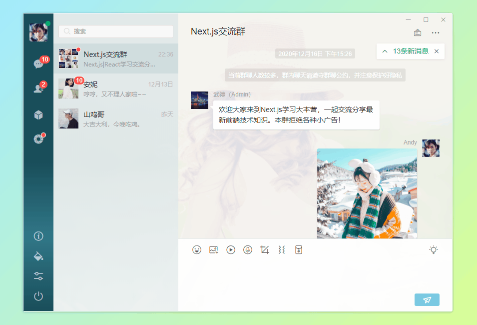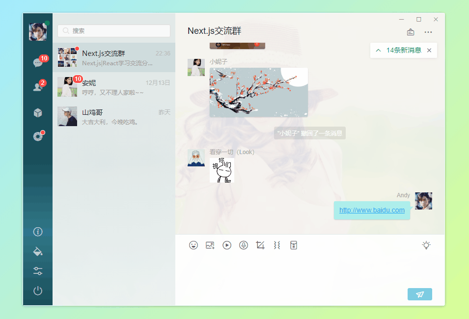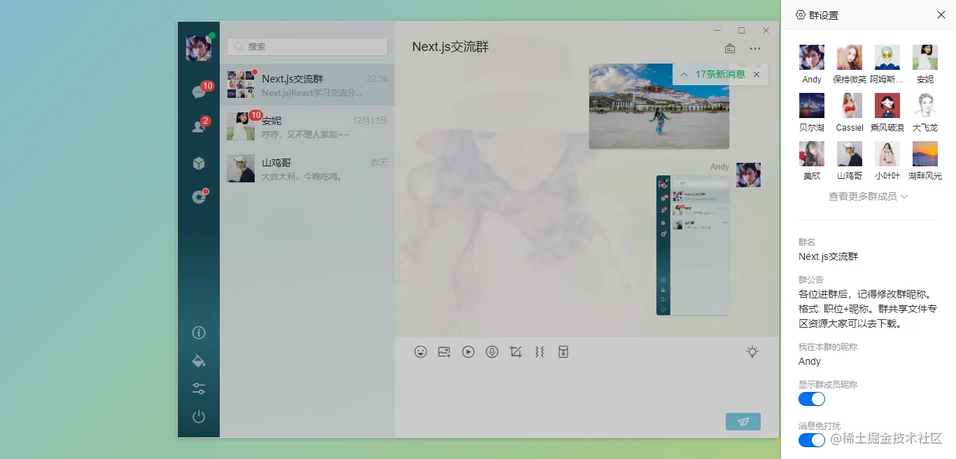 支持拖拽图片至聊天区域发送、截图粘贴发送等功能。