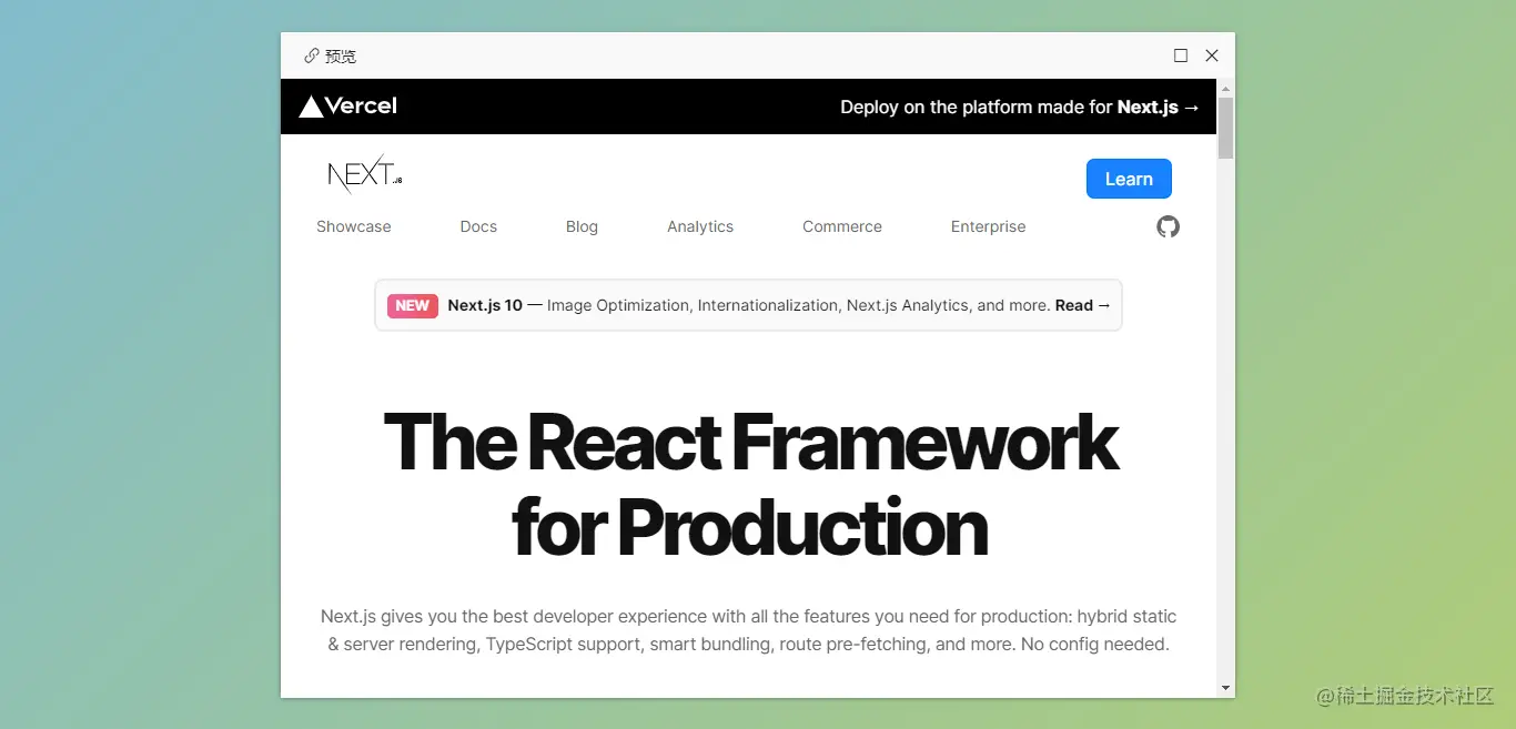 基于 React.js 服务端渲染的 SSR 开发框架。Next.js 预设了利用 react.js 开发服务端渲染的应用所需要的各种配置。让你的网页拥有SEO功能。