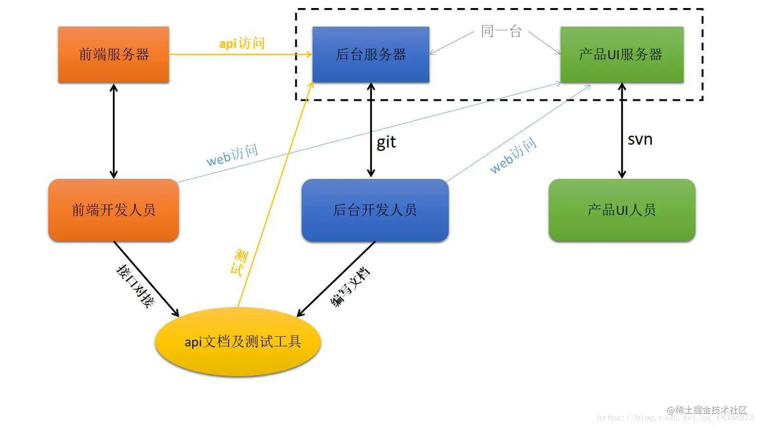 公司技术团队分为前端,后台,产品,UI,刚进公司时花了大概一天时间用于整体的环境和流程搭建,如下图所示:
