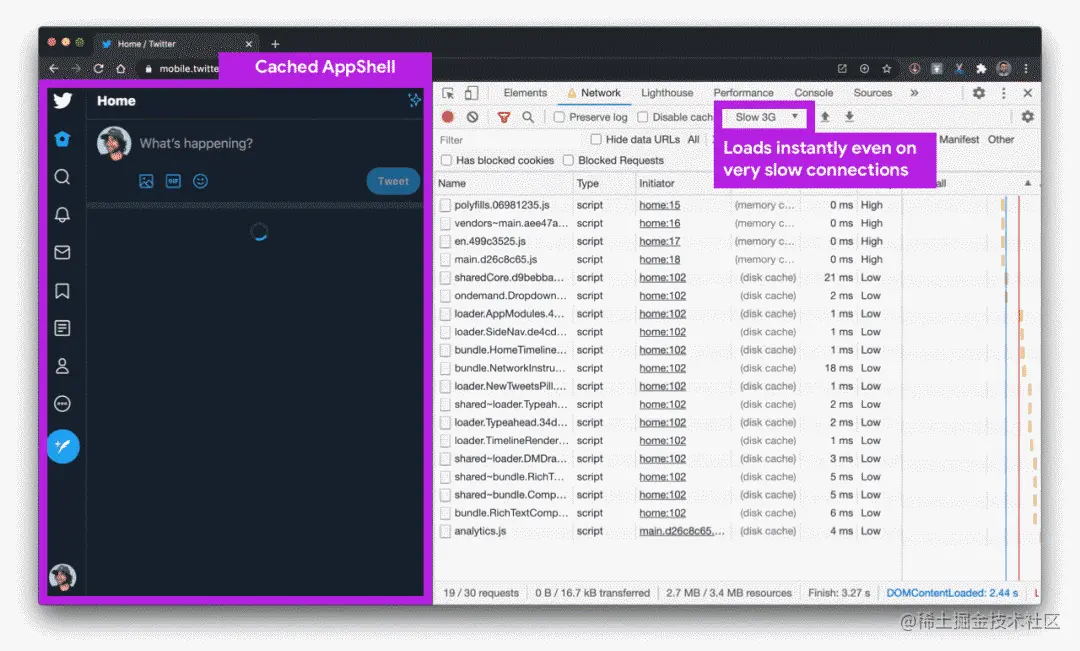 他们的应用程序外壳程序(骨架 UI)也是离线缓存的,就算用户通过缓慢或不稳定的网络连接加载站点,也会立即加载它们:
