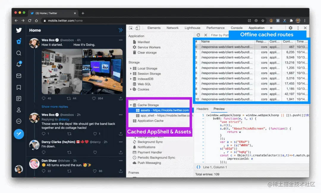 其他路由会按需延迟加载。Twitter 在整个用户体验部分中会按需提供 40 多个块。Twitter 还使用服务 Workers 对其他路由进行(离线)资产预缓存,以提高对后续导航操作的响应能力:
